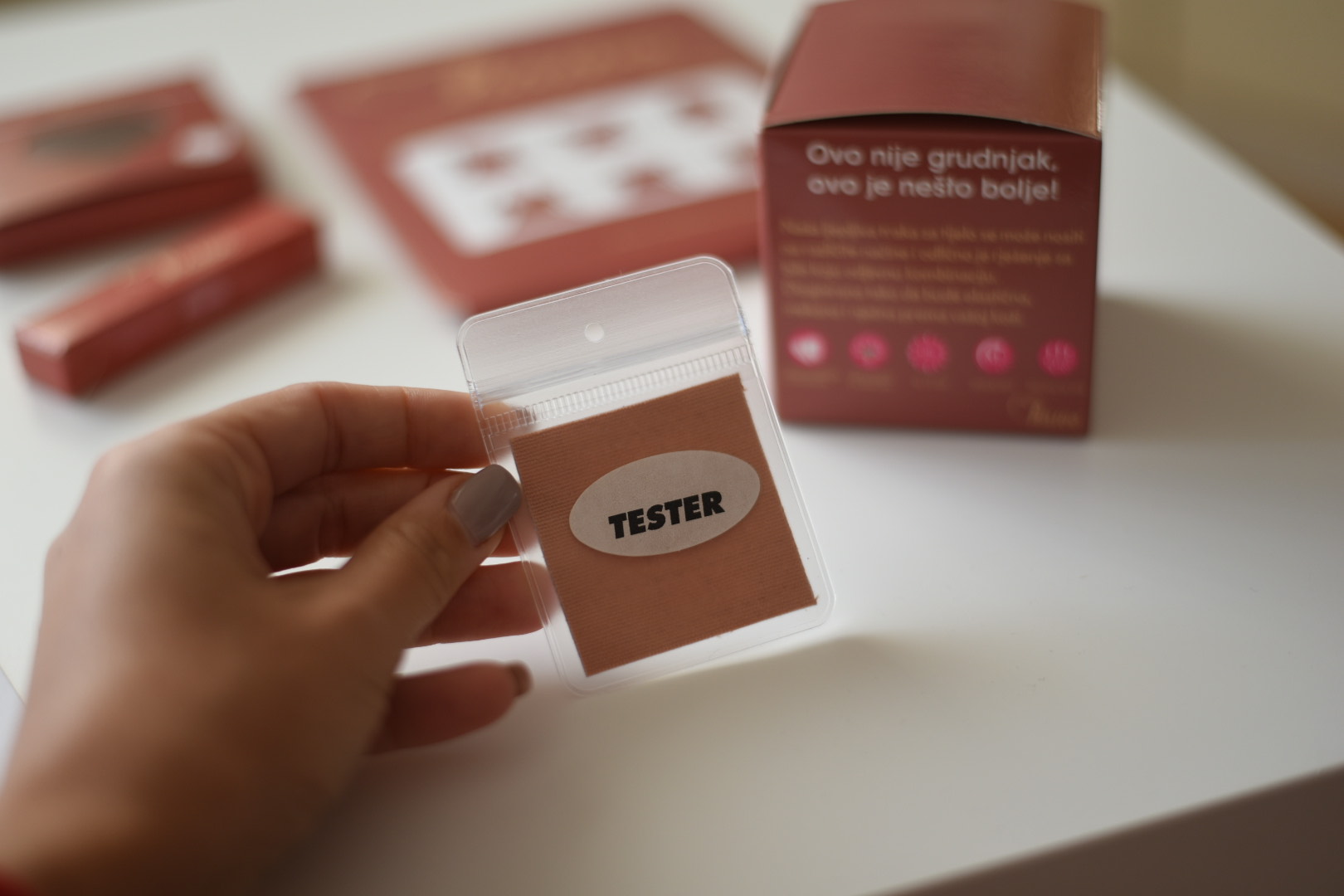 Pri kupovini proizvoda dobijete i tester. Tester odlepite od zaštitnog papira i zalepite na kožu na vašim prsima, na područje gdje nameravate i lepiti navlaku. Tester držite na koži minimalno 12 sati. Ukoliko osetite svrab, oticanje, osip, nelagodu ili bilo kakvu reakciju proizvoda na koži, proizvod nemojte koristiti.